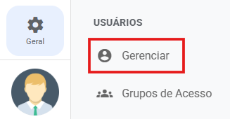 Este menu possui duas abas: Gerenciar e Grupos de Acesso. O primeiro é onde você entrará para cadastrar um usuário.