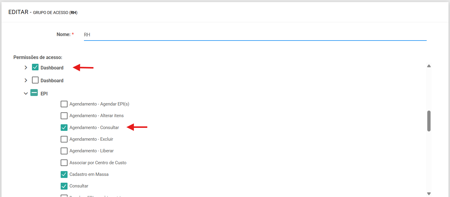 Exemplo: Considere um grupo de usuários do Departamento Pessoal cuja única necessidade é a visualização das Fichas de EPI. Você deve criar um grupo com o nome sugestivo, como "Consultas - Ficha de EPI", e marcar exclusivamente a permissão de Consultar.
