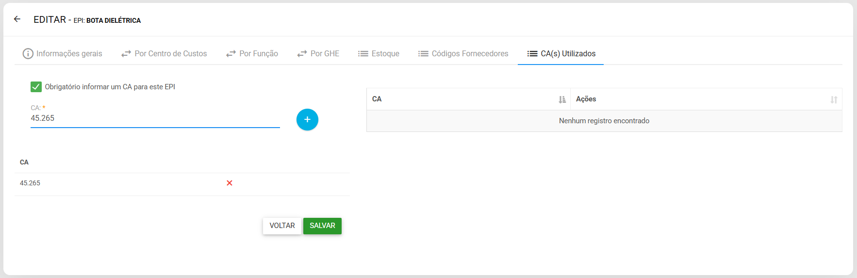 4. Para cadastrar um CA, digite-o no campo disponibilizado e clique no botão +. Pode ser inserido quantos forem necessários. Após isso, clique em Salvar para finalizar.