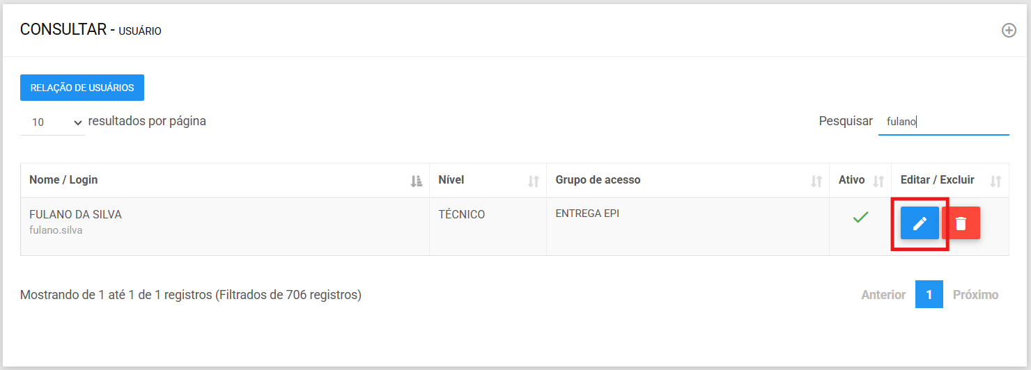 2. A opção Gerenciar exibe todos os funcionários cadastrados. Ao clicar em Editar, no lápis, o painel do usuário será aberto, permitindo a alteração de dados do funcionário.