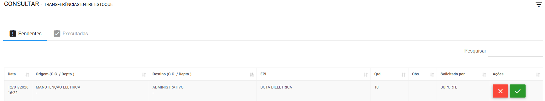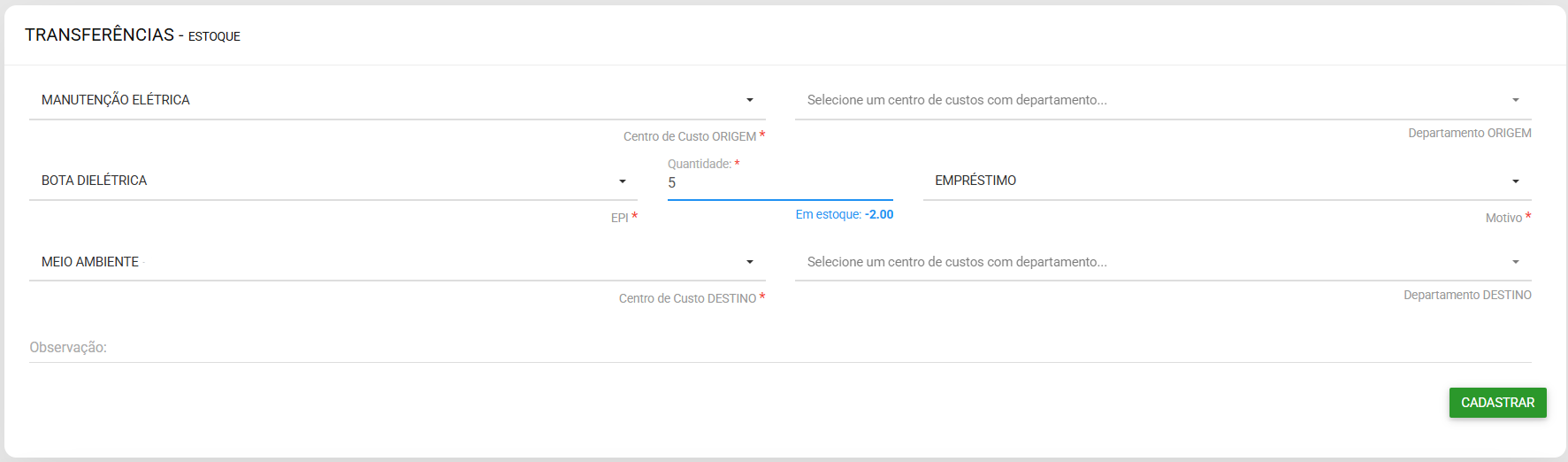 2. Realize o lançamento de transferências de EPI de um centro de custo para outro.