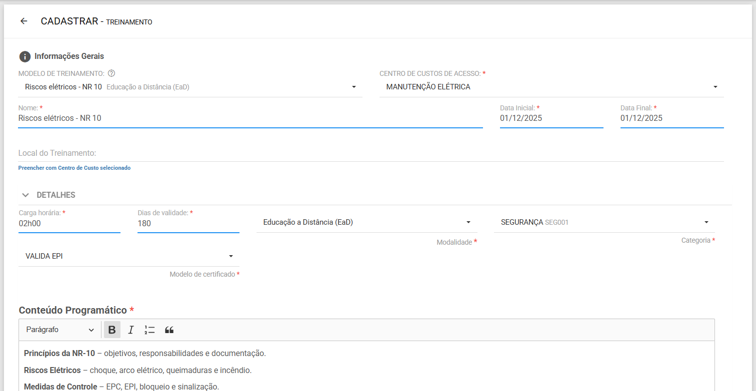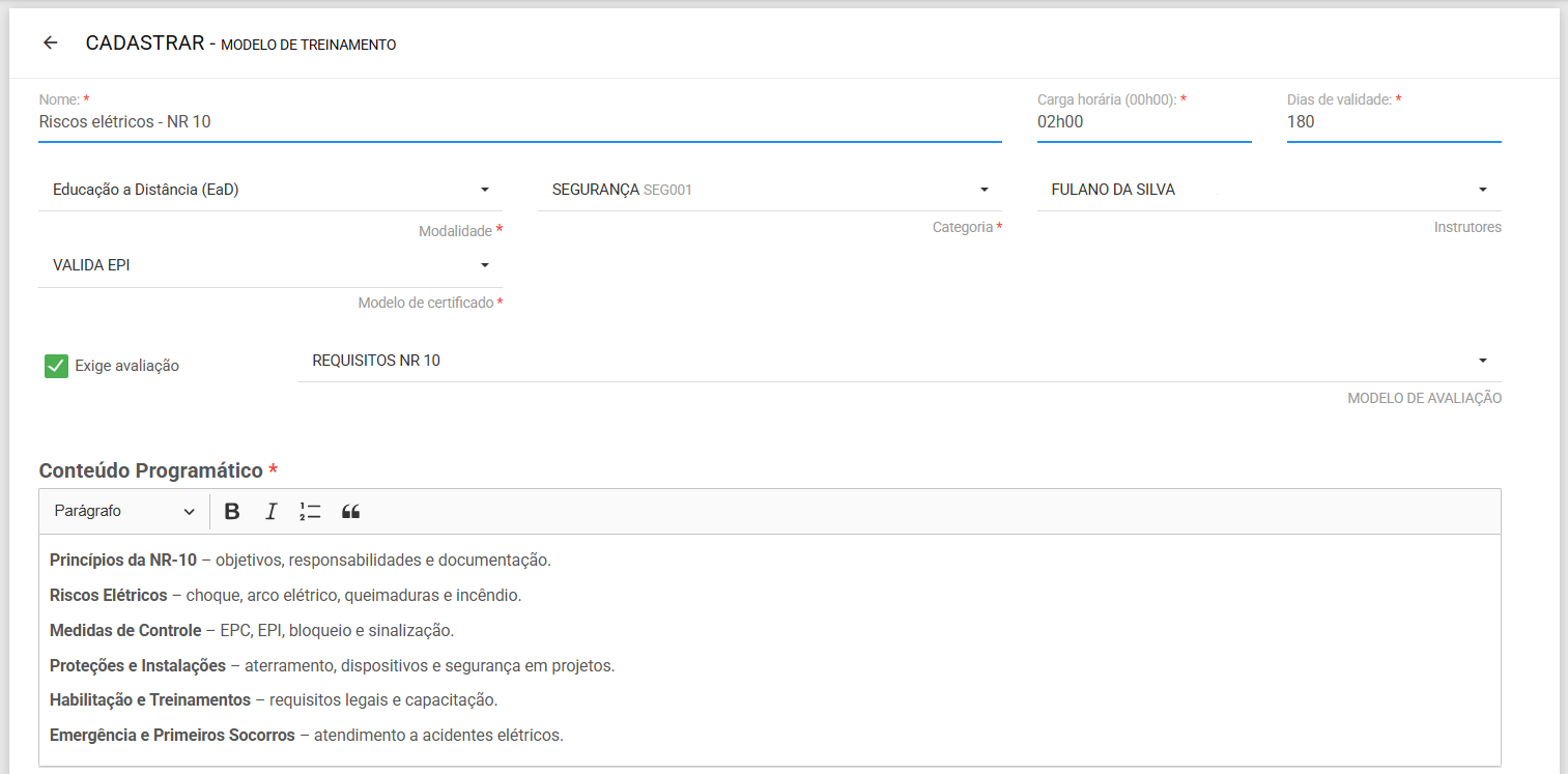 Informações como carga horária, dias de validade, e outros parâmetros, serão solicitadas. Inclusive, os outros quatro parâmetros que serão cadastrado nesse módulo (categoria, instrutor, avaliação e e certificado) podem e serão utilizados no cadastro de Modelo de Treinamento.