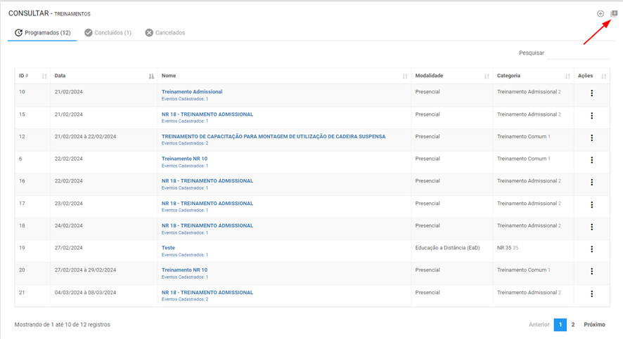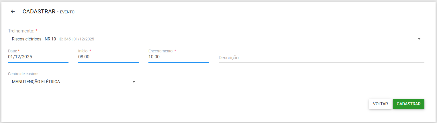 Para mais detalhes do cadastro de eventos clique aqui.3. Cadastrar treinamento em massa