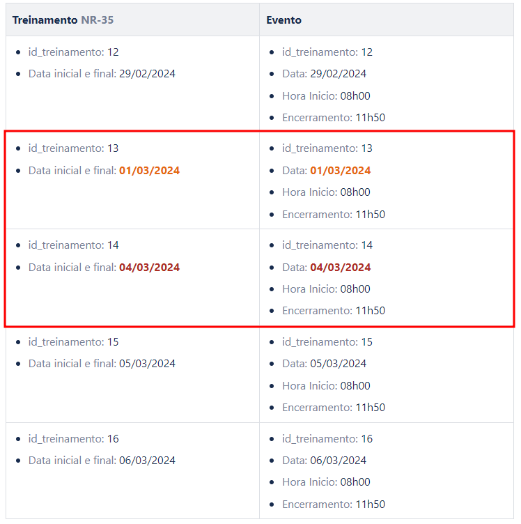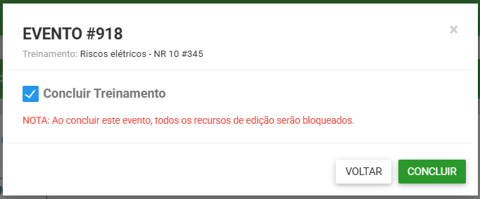 O treinamento é composto por um ou mais eventos. Exemplo: O treinamento de Riscos Elétricos (1 treinamento) será feito nos dias 1 a 5 de dezembro (5 eventos).