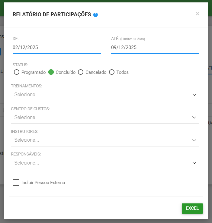 Na própria aba de Treinamento, é possível emitir relatório dos eventos programados, concluídos e cancelados, permitindo exportar em arquivo .xlsx contendo informações como centro de custos, instrutores, responsáveis, etc.