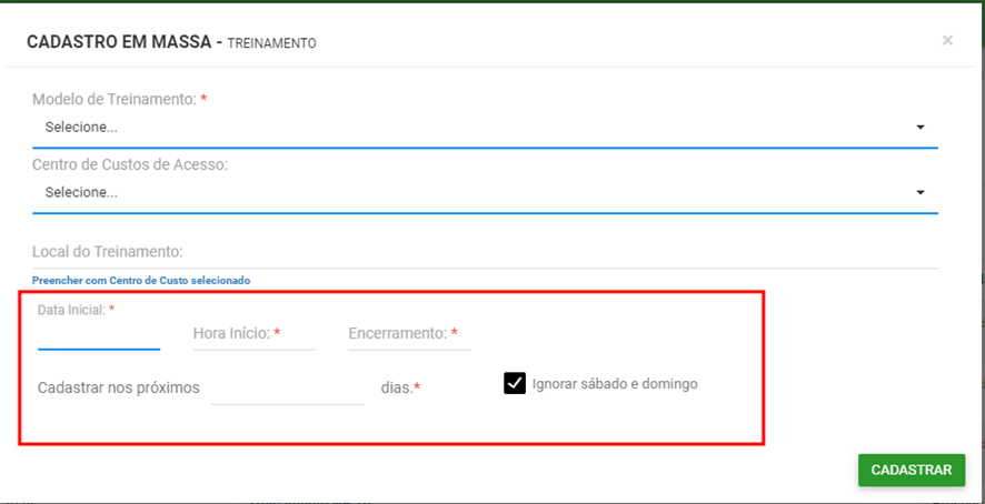 3.2. Na aba de cadastro selecionamos o modelo e centro de custo do treinamento, e definimos a data inicial do treinamento e seu evento, bem como os horários de inicio e fim.