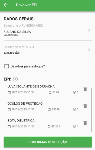 4. Selecione o funcionário e o motivo da devolução. Clicando no +, mostrará todas as entregas, assim como mais detalhes. Para selecionar mais de um EPI, clique no +.
