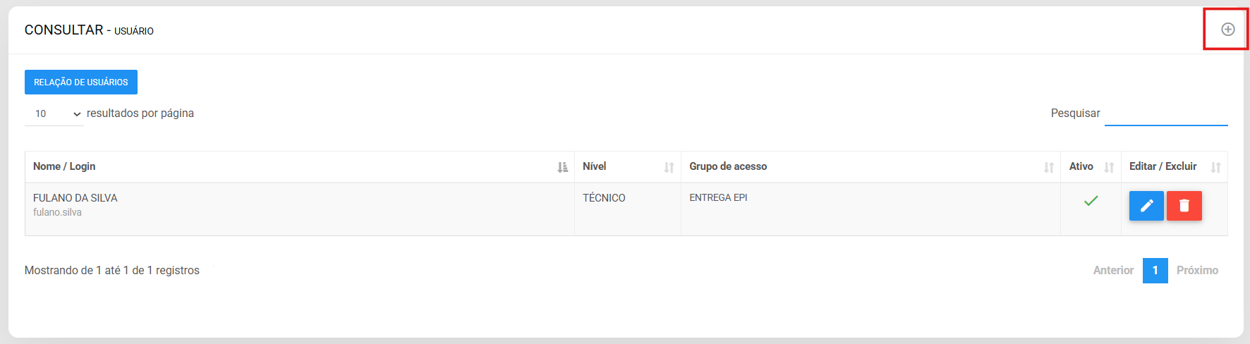 3. Clique no ícone + para cadastrar um usuário.