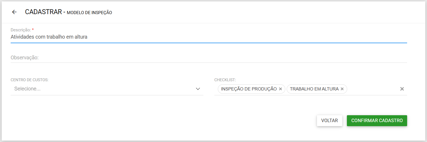 4.2. Selecione o modelo de inspeção. Nele já estarão cadastrados os checklists vinculados anteriormente. Depois, informe o centro de custo e dê início à inspeção.