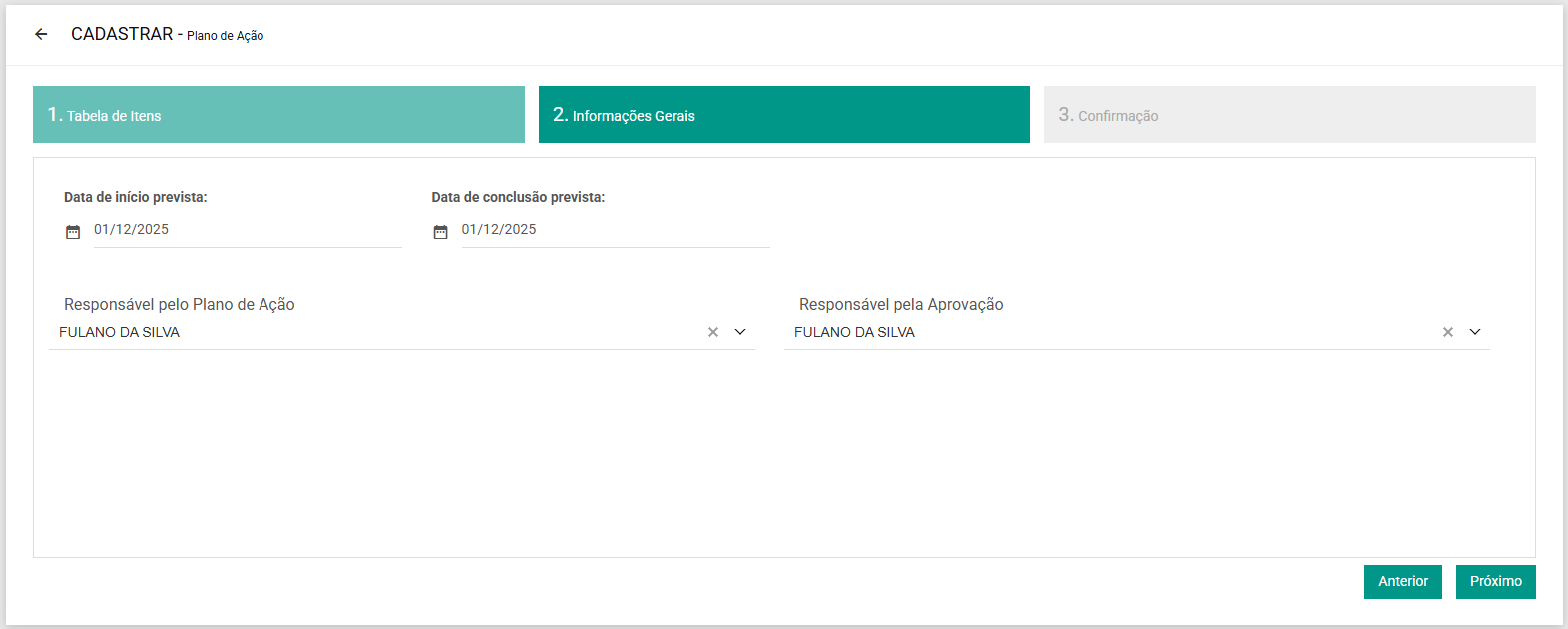 5.3. Informe a data de início e a data prevista de conclusão, bem como os responsáveis. Revise todas as informações e confirme o Plano de Ação.