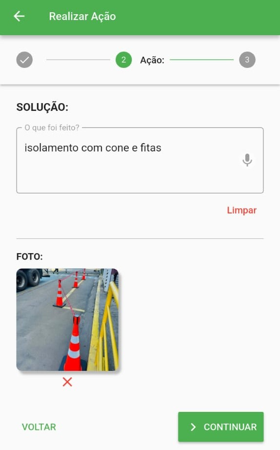 Informe a solução adotada e anexe uma foto, seja a partir da galeria do celular ou utilizando a câmera. Para a descrição da solução, também é possível utilizar a transcrição de áudio.