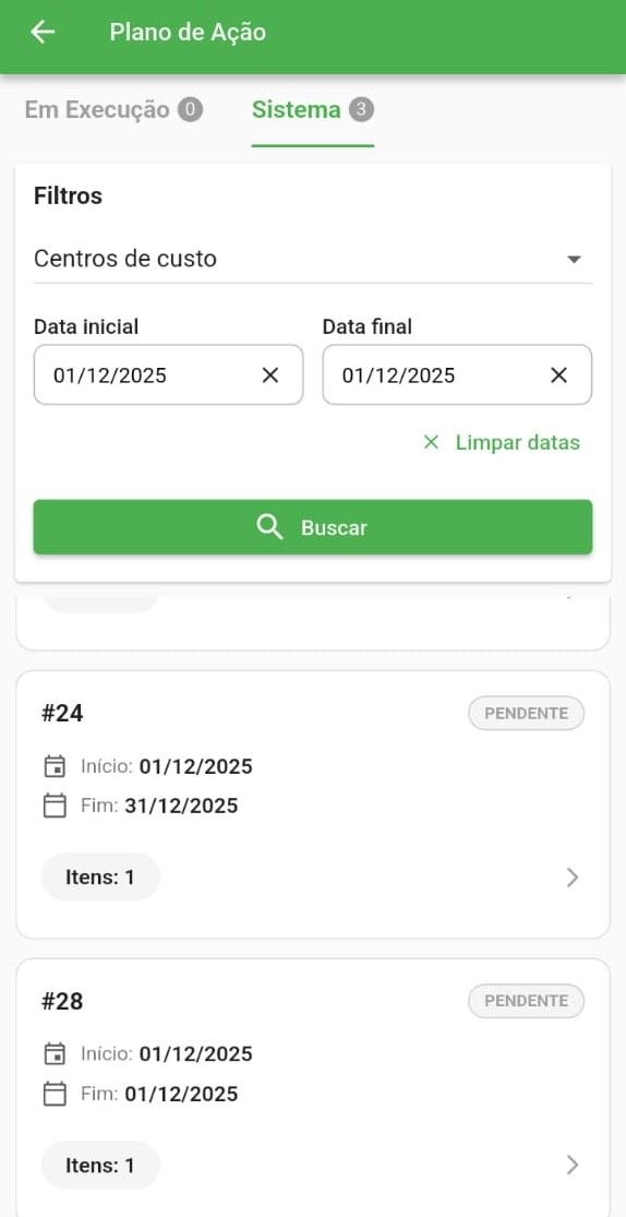 Nesse módulo, há duas abas: Sistema, que contém todos os planos de ação a serem criados, e Em Execução, utilizada em casos de uso offline ou quando o processo é interrompido, fazendo com que o plano permaneça nessa aba. Localize o Plano de Ação criado utilizando os filtros conforme sua necessidade.