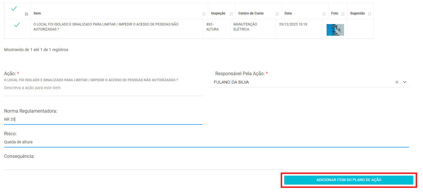5.2. Selecione o item não conforme para o qual serão definidas ações. Preencha os dados necessários, como tipo de ação, responsável, nível de risco, entre outros. Em seguida, clique no botão azul Adicionar Item para cadastrar a ação.