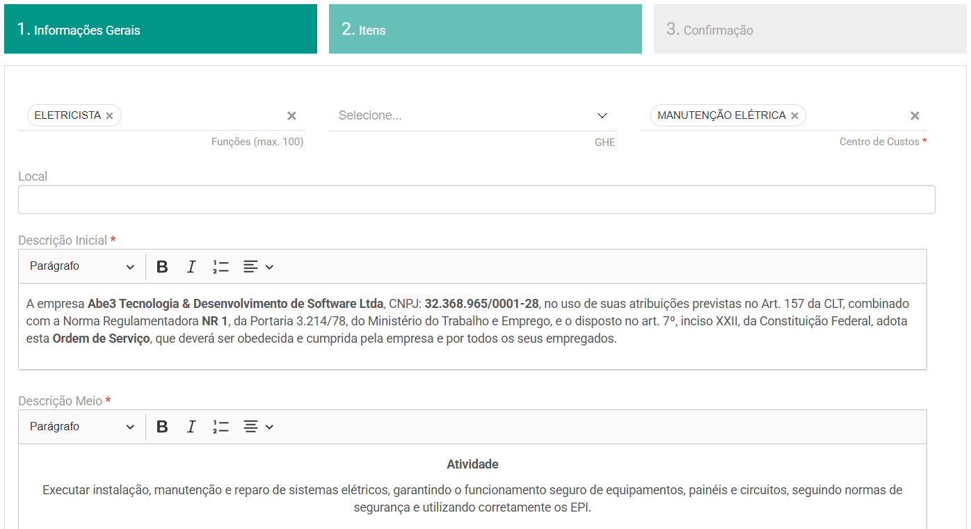 2.1. Para cadastrar uma OS, é necessário informar a função e o centro de custo, sendo possível inserir um texto personalizado que esteja de acordo com a realidade da empresa e com as normas vigentes.