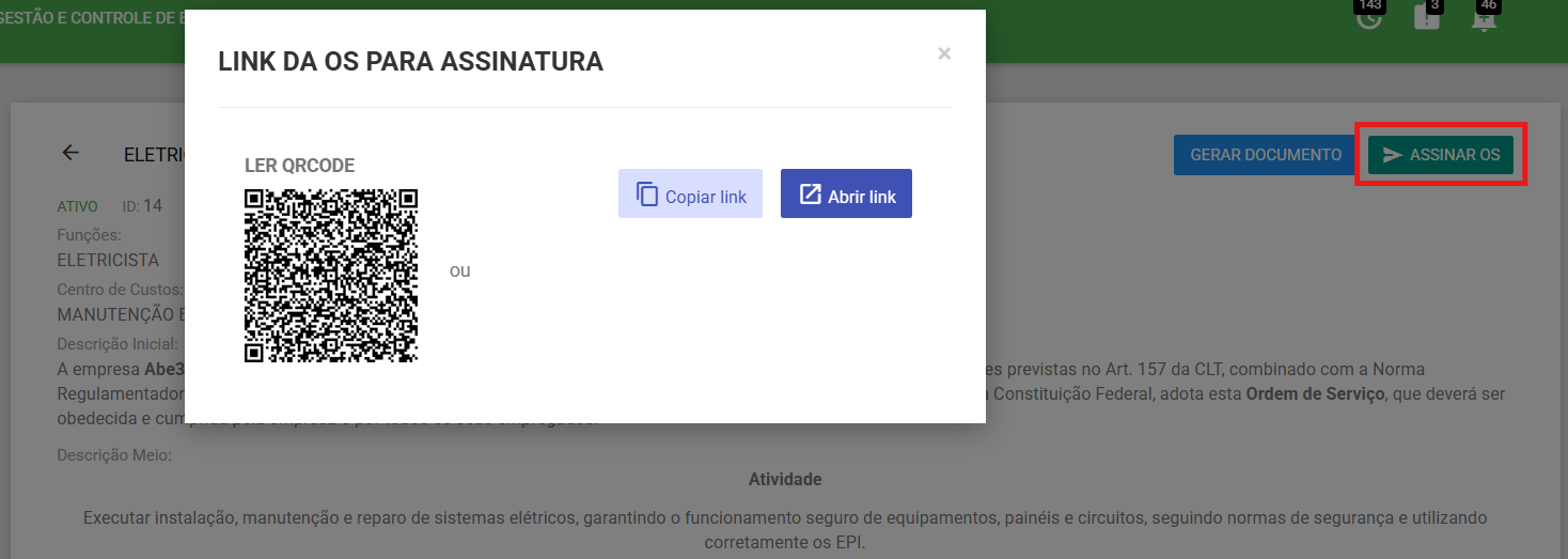 3.1. Ao gerar a OS, será disponibilizado um botão de assinatura, que permite ao funcionário assinar por meio de link ou QR code.