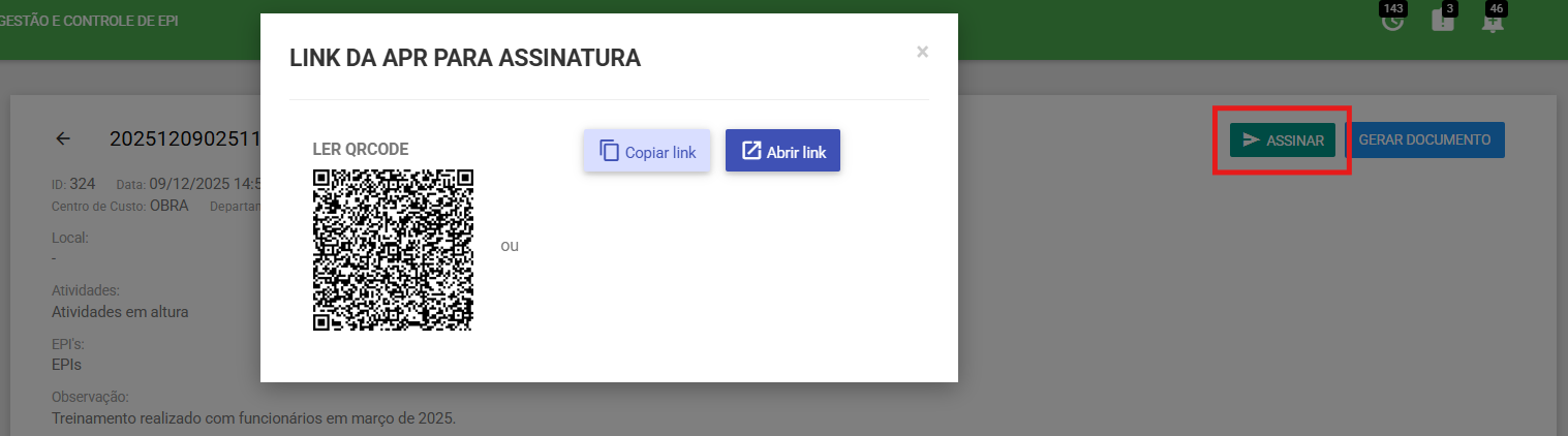 4.1. Ao gerar a APT, será disponibilizado um botão de assinatura, que permite ao funcionário assinar por meio de link ou QR Code.