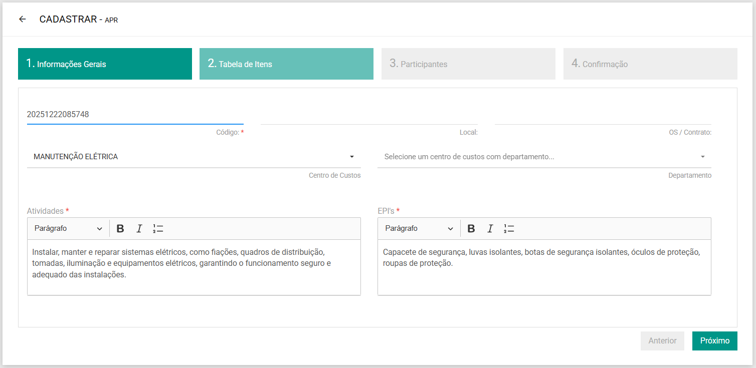 3.1. O cadastro inicia com a informação de Centro de Custo, descrição da atividade e EPIs recomendados.