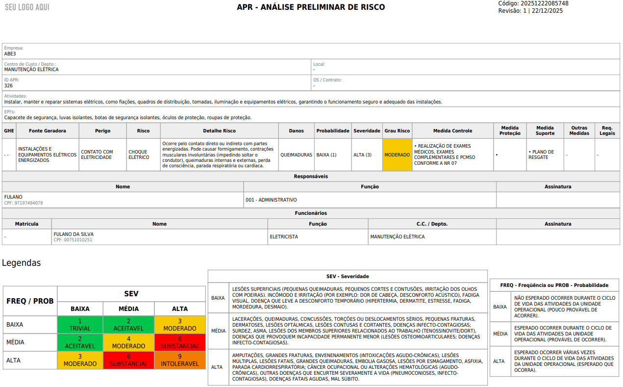 O módulo de Análise Preliminar de Risco (APR) permite cadastrar e gerenciar informações essenciais sobre riscos, perigos, fontes geradoras, possíveis danos, medidas de controle e a matriz de risco de cada atividade. Com ele, é possível organizar a prevenção de acidentes de forma estruturada, classificando e priorizando os riscos de acordo com sua severidade e probabilidade, sempre em conformidade com a NR-1, que estabelece a obrigatoriedade de medidas de segurança e saúde no trabalho.