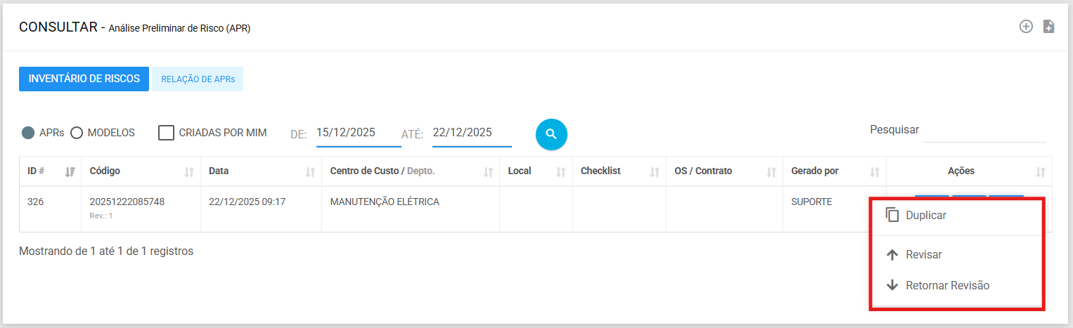 3.6. Na aba de consulta, em ações, você tem a possibilidade de revisar a APR e duplicar, para caso nova APR com as mesmas informações precise ser criada.