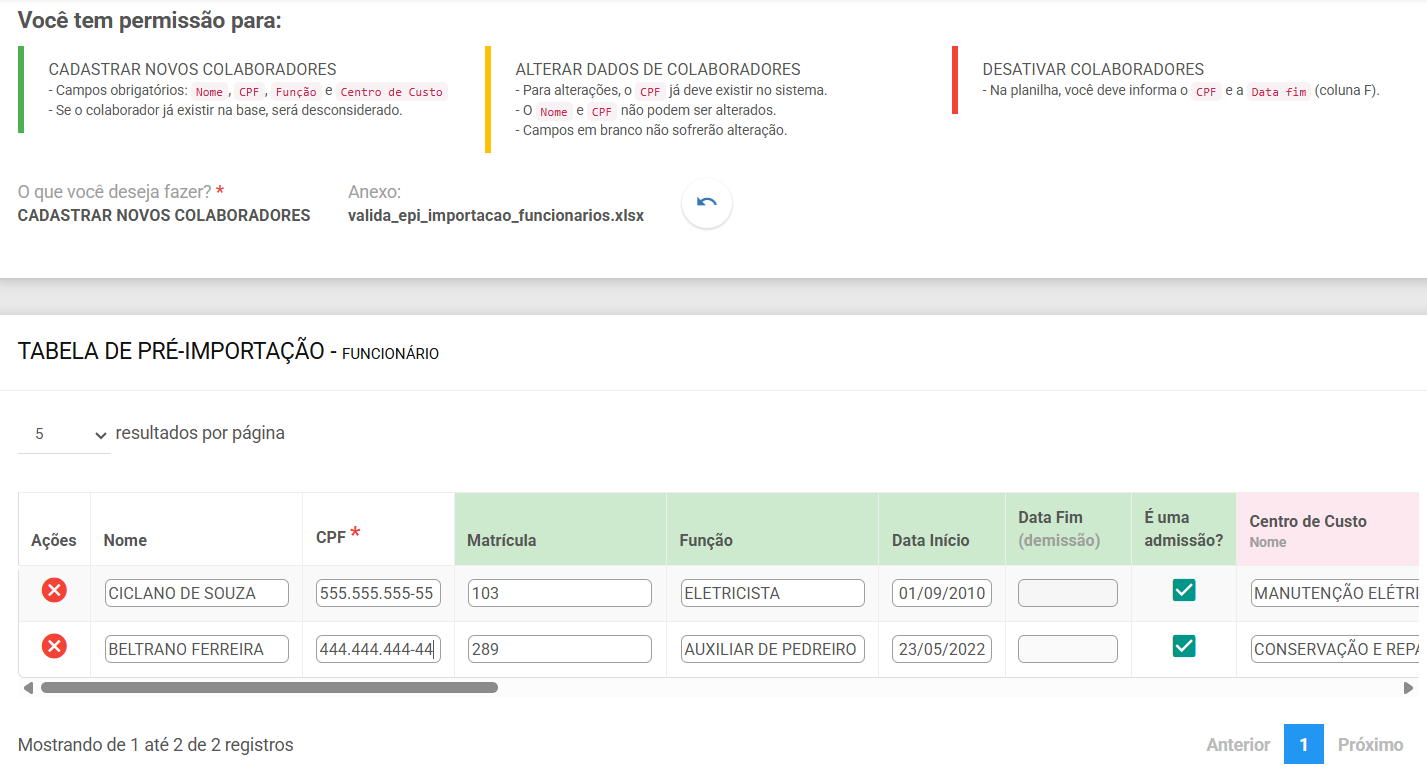 - É necessário garantir que os dados de Função e Centro de Custo estejam escritos exatamente da mesma forma, respeitando letras maiúsculas e minúsculas e o espaçamento. Caso contrário, será criada uma nova função ou um novo centro de custo.